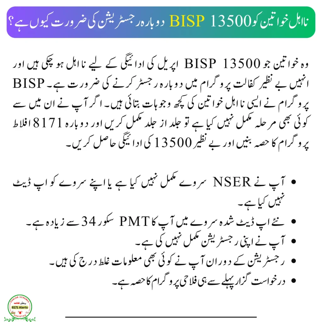 Women who have become ineligible for the BISP 13500 April payment and need to re-register in Benazir Kafalat Program. The BISP Program has provided some reasons for such ineligible women. If you have not completed any of these steps, then complete the steps as soon as possible and become a part of the 8171 afalat Program again and get Benazir 13500 payments.