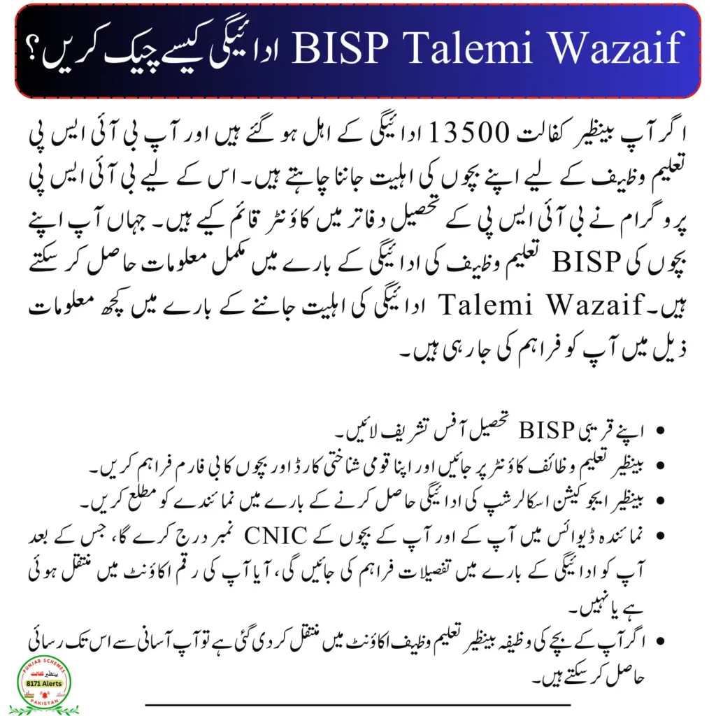 The Benazir Income Support Program has started the BISP Taleemi Wazaif Payment with the April 2025 8171 Kafalat Qist. Those women who are eligible for the Benazir Kafalat Program and have received a confirmation SMS of getting 13500. Such women can also get the Benazir Taleemi Wazaif for their children along with their payment.